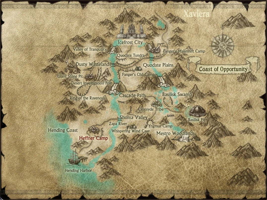 Transport: Heffner Camp, and a notice that you're eligible to choose a third class (see Classes). Snoop the Stubborn now remembers how to send you to Heffner Camp as well. Hending Harbor is the starting area of Coast of Opportunity.