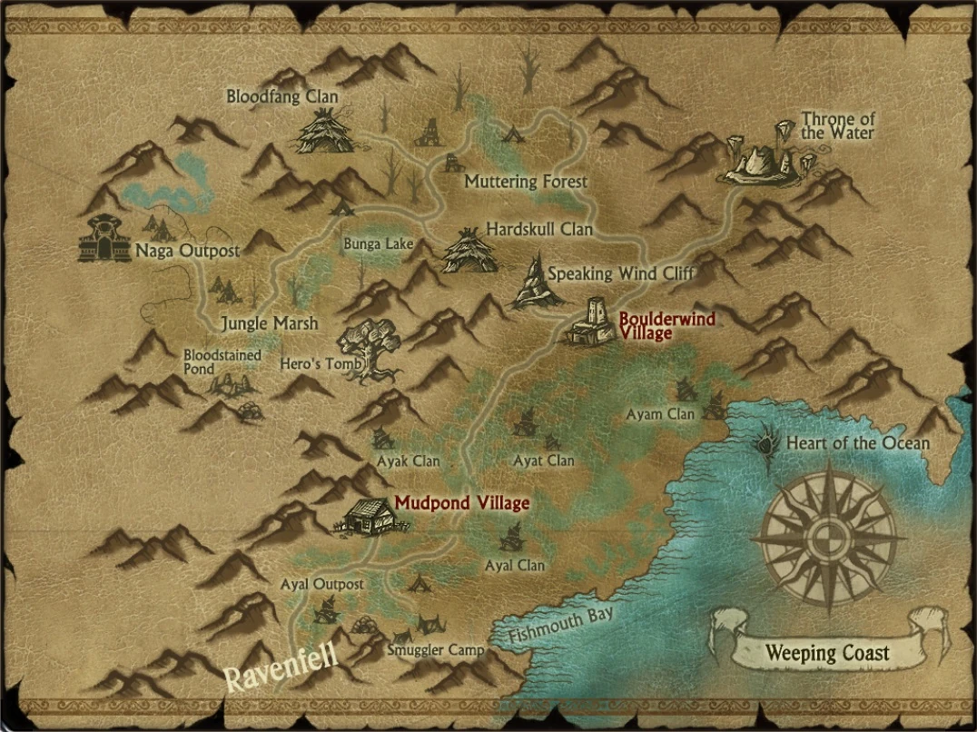 A small village situated at the foot of Speaking Wind Cliff. It is the biggest and most important settlement of Weeping Coast. Before Weeping Coast turned into the lawless and unsafe place it is today, Boulderwind Village had been a prosperous trade post. Merchants from Varanas and the Obsidian stronghold came here to acquire valuable goods of every imaginable kind for low prices from the local woodmen, hunters, herbalists and peasants. On the acres near the village, a famous local produce can be found: water bone leaves, a most precious ingredient for sophisticated medicines. Every year during harvest, medicine traders from the big cities, doctors or adventurers from afar would come to Boulderwind Village to purchase some of the rare water bone leaves.